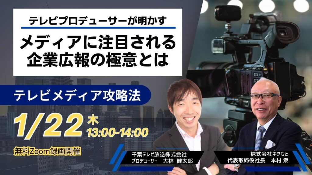本ウェビナーでは、弊社契約企業様向け「メディアセミナー」でもご登壇いただいている千葉テレビ放送株式会社 プロデューサー 大林健太郎氏をゲストにお迎えし、テレビ業界の最前線で活躍するプロの視点から「メディアに注目される企業広報の極意」についてたっぷりと語っていただきます。