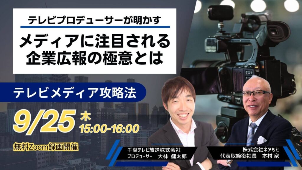 本ウェビナーでは、弊社契約企業様向け「メディアセミナー」でもご登壇いただいている千葉テレビ放送株式会社プロデューサー・大林健太郎氏をゲストにお迎えし、テレビ業界の最前線で活躍するプロの視点から「メディアに注目される企業広報の極意」についてたっぷりと語っていただきます。
