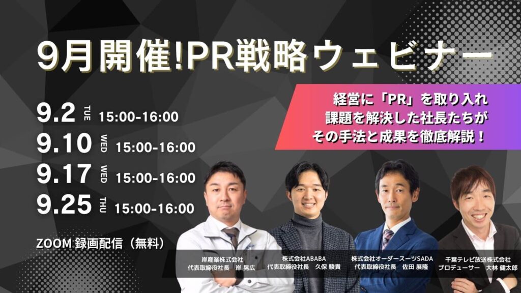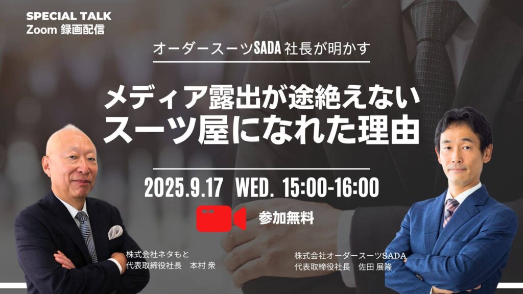 「メディアに取り上げられるには、どうすればいいのか 」多くの企業が切望する中、約10年間に渡りメディアからオファーを受け続けている企業があります。本ウェビナーでは、株式会社オーダースーツSADA 佐田社長が広報PRを経営に取り入れ成功した具体的手法を公開!